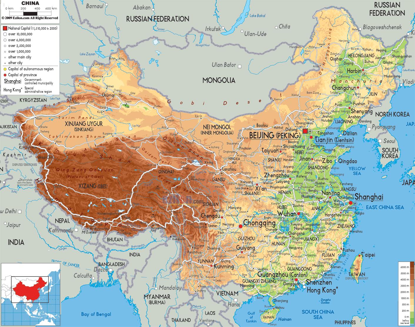 Кітай на карце. Падбародак карце (Усходняя Азія - Азія) для друку. Падбародак карце (у Усходняй Азіі - Азія) спампаваць.